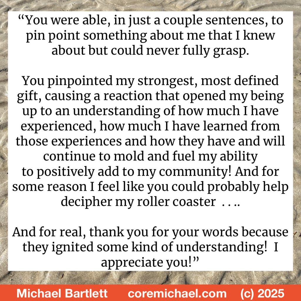 Michael shows me how I can use my own tools to pull myself up and out of the mud—with humor, clarity, and compassion—while never letting me forget that, yes, I am strong enough to do it. Even the smallest insights, like his comment about being a “busy body,” land with deep impact. That one helped me recognize that when I give energy or advice to people who haven’t asked for it, they won’t respect it.